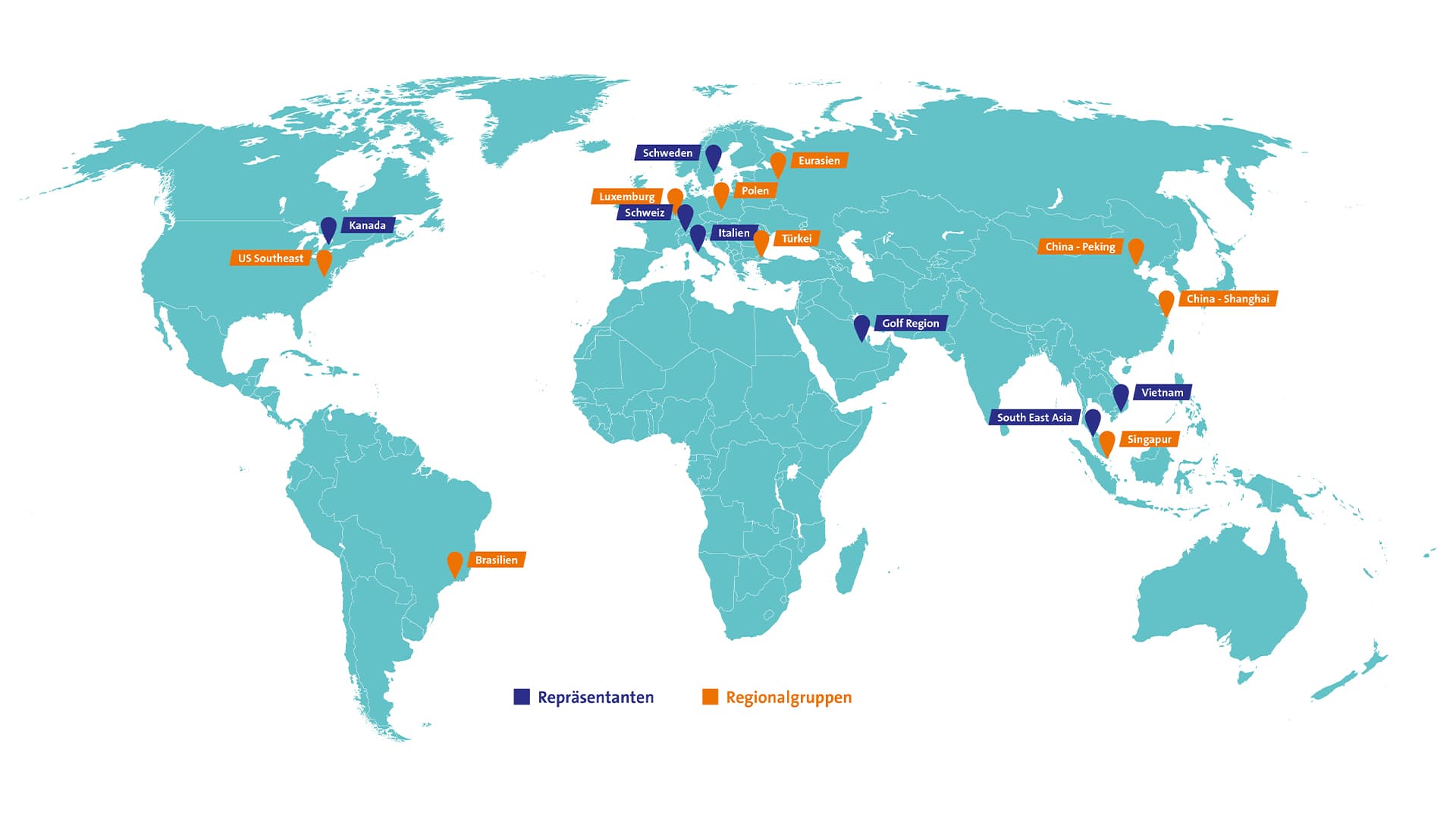 Deutschlandkarte mit allen Regionalgruppen und internationalen Standorten als zentrales Element